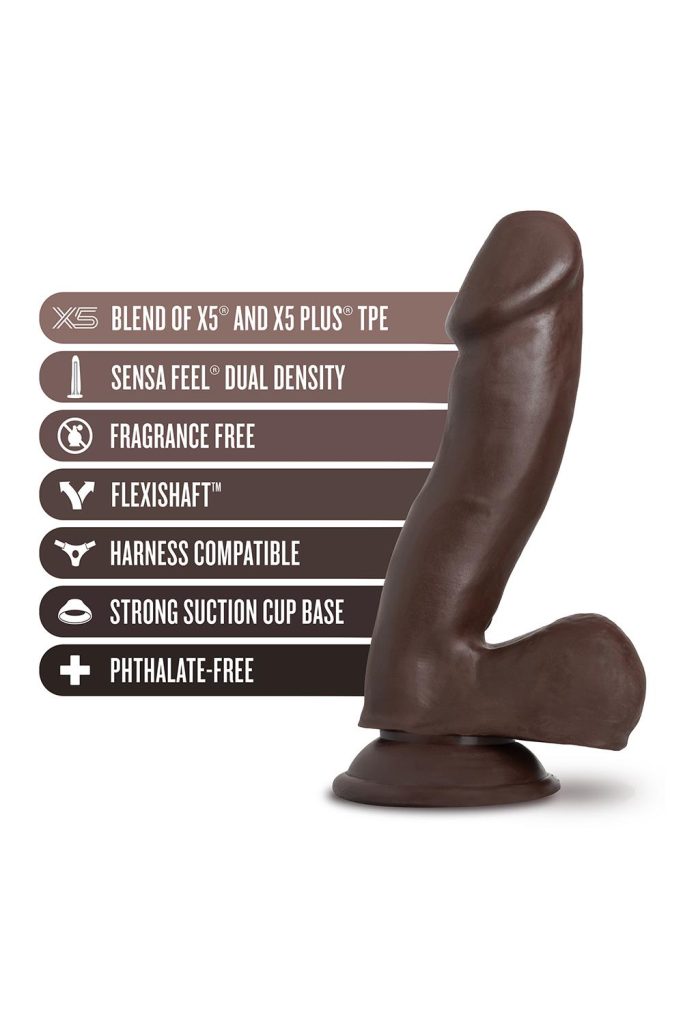 Izrađen od mješavine X5 i X5 Plus TPE materijala, pruža mekani i realistični osjećaj. Ima čvrstu bazu s vakumskom čašicom, kompatibilan je s remenom za strap-on igre.